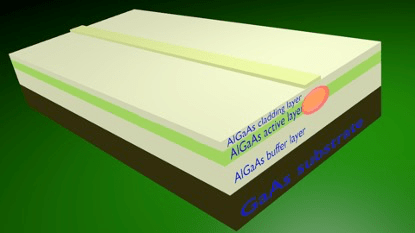 thick Al0.25Ga0.75As. The active layer is thick Al0.18Ga0.82As. The cladding layer is thick Al0.25Ga0.75As. The mesa strip is wide and in height. The approximate position of the guided light at the facet is indicated by the red area.