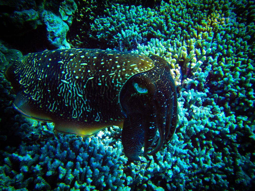 Here’s a video of a cuttle fish mating behaviour, according to Clive the dive master “they are always at it” – the video shows a large male protecting the female in contention from challengers – they are flashing to each other signalling no doubt the cuttle fish equivalent of “are you looking at my girl friend”. They are four “Fs” of animal behaviour, fleeing, feeding, fighting and reproduction and is this video we have fighting and reproduction.