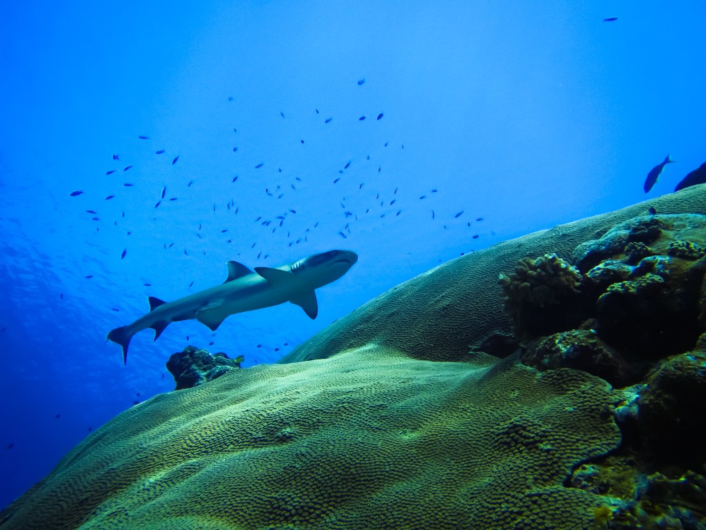Heres’ a white tipped reef shark resting on the sandy bottom and being cleaned